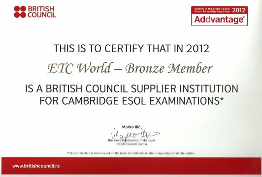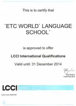Jezička škola ETC WORLD, kao jedina u svom gradu i Moravičkom okrugu poseduje licencu Privredne komore u Londonu i jedina je akreditovan ispitni centar za EDI /LCCI ispite koji od ove godine postoje pod nazivom PEARSON ispiti.