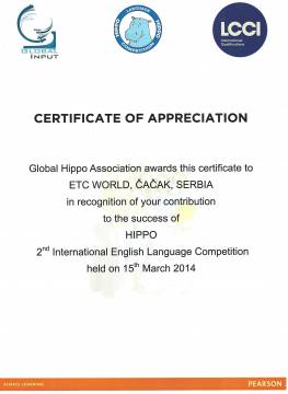 Kao dugogodišnji akreditovan LCCI centar uspešno smo organizovali do juna 2020 . godine JET SET ispite , a od jula 2020. godine naša škola poseduje licencu za pripremu i polaganje akreditovanih PEARSON ispita. HIPPO medjunarodno takmičenje iz engleskog jezika, koje se održava u Italiji u maju svake godine je u poslednjih 9 godina jedna od aktivnosti naše škole na koju smo posebno ponosni.